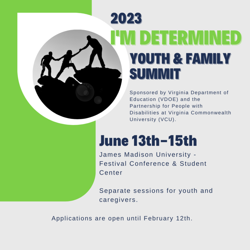 The GCPS Office of Special Education would like to share information regarding the 2023 I’m Determined Youth Summit sponsored by the Virginia Department of Education and the Partnership for People with Disabilities at Virginia Commonwealth University. This three-day event brings together youth with disabilities and their families. To learn more and sign up for more newsletters from the Virginia Department of Education, visit: https://content.govdelivery.com/accounts/VADOE/bulletins/3463d29